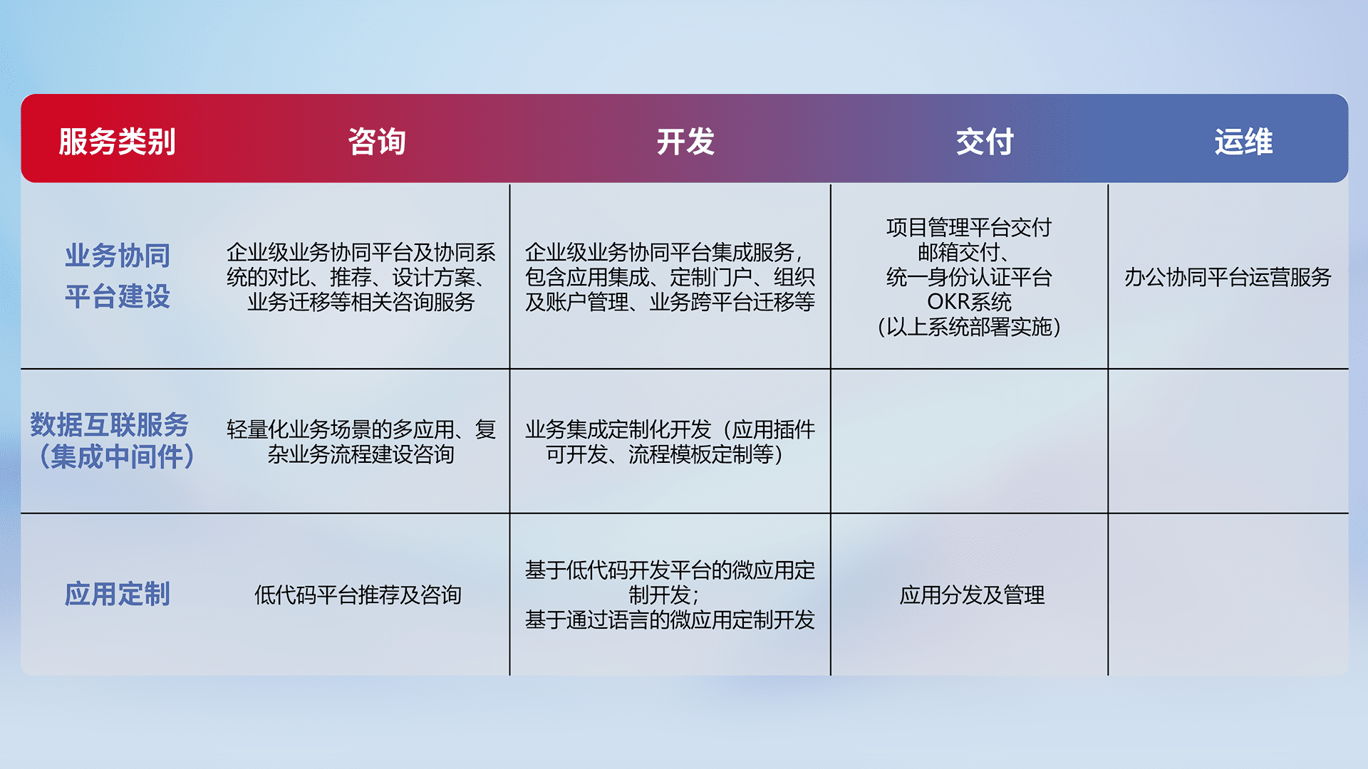 针对钉钉、、企微、、、IDaas等平台级产品提供产品的规划、、方案、、交付、、、定制化开发等服务,,,实现如统一协同办公、、智能客户服务、、混合会议管理、、、、智能数据查询、、、、等业务场景,,,实现数字化转型。。