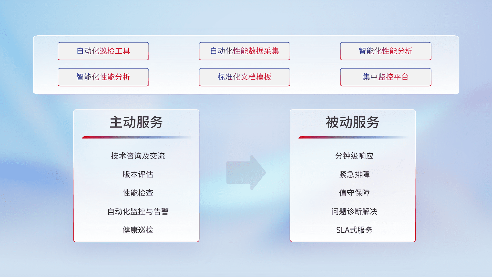 智能化工具和标准化文档,,,,保障服务质量,,,提供主动服务(包含技术咨询、、版本评估、、、、性能检查、、、自动化监控与告警、、、、健康巡检)和被动服务包含(分钟级响应、、、紧急排障、、、、值守保障、、、问题诊断解决、、SLA服务)。。。